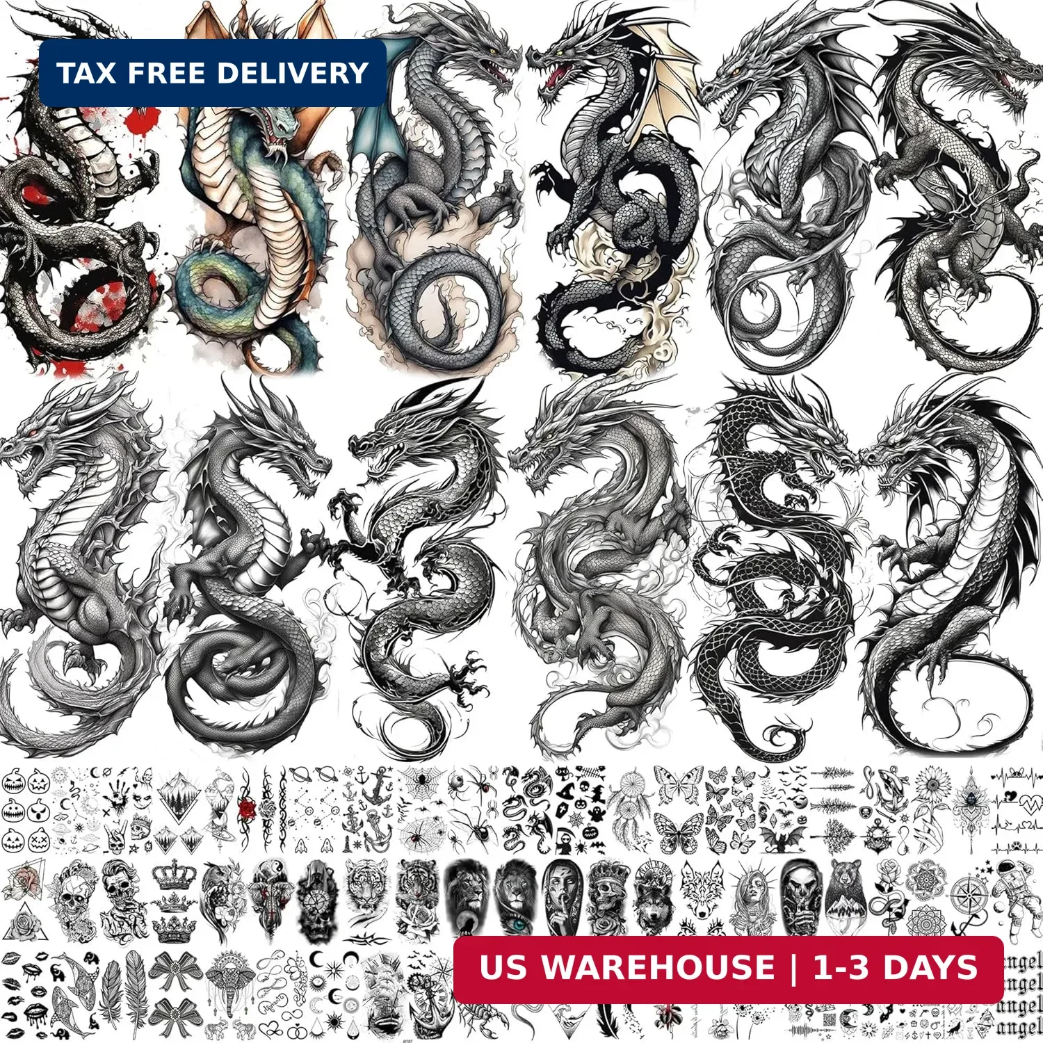 • šŸŽ”ć€Package Includes:怑 76 Sheets Black Dragon Temporary Tattoos For Women Men Adults Including 12 Sheets Half Arm Sleeve Tattoo Stickers and 64 Sheets Tiny Cute Small Fake Tattoos For Kids Boys Girls, 3D Gothic Tatoos Universe Planets Star Moon Spider Web Cross Birds Scorpion Bat Ghost Elephant Flower Floral Sailing Ship Pirate Compass Anchor Butterfly Skull Skeleton Maori Totem Wolf Tiger Lion Dragon Eagle Owl Bear Crown Mountain Sea Wave Snake Tree infinity Letter Words Quotes Abstract ECG Feather Gangster Minimalism Coyote Feather Astronaut Whale Lotus Dreamcatcher.