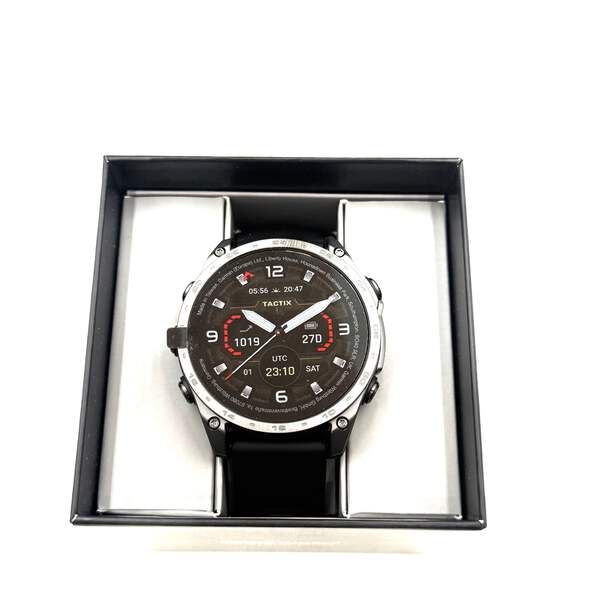 This Garmin smart watch is brand new in box and features a black finish with a 47mm watch size. It includes a sport band and a titanium case material. Connectivity is GPS only, and there is no IMEI since this is a GPS-only model. The item is offered in new condition and is ready for use right out of the box.
