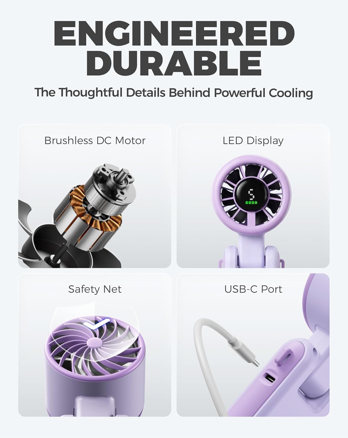 Ultra Powerful Wind,Rapid Cooling: Stay cool on the go with the JetForce handheld turbo fan! Featuring Aero-Turbojet technology,a high-speed three-phase brushl motor,and a 5-blade design,this handheld fan delivers a maximum wind speed of 10m/s—3x more powerful than neral fans.