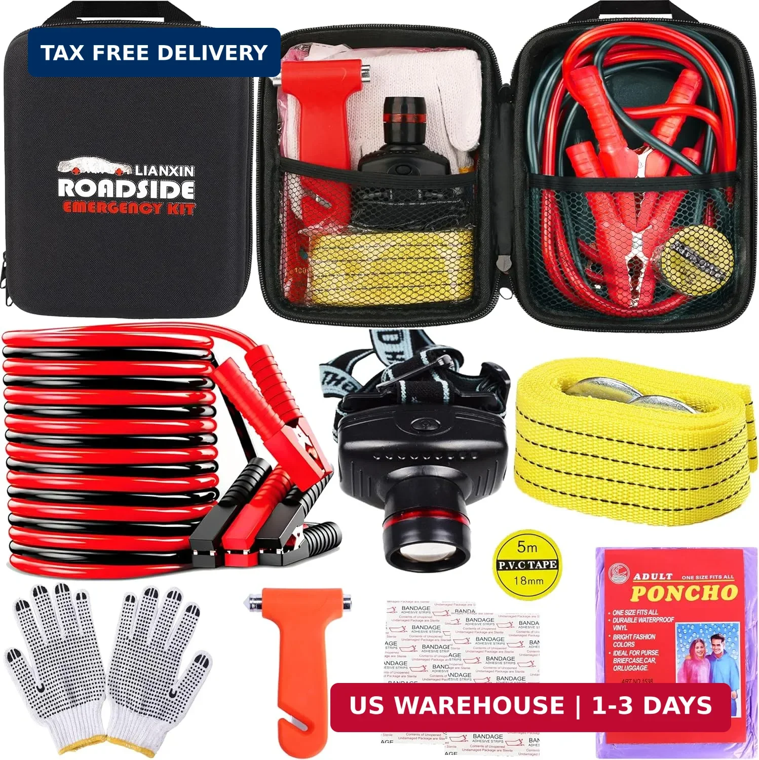 • ESSENTIAL RESOURCES: From car jumper cables kit, rainwear, headlamps, and safety hammers to tow ropes, non-slip gloves, first aid bandages, and PVC tape, we've got all the practical supplies you need to stay safe in a roadside emergency.With these, you'll be prepared for almost everything the road throws your way.