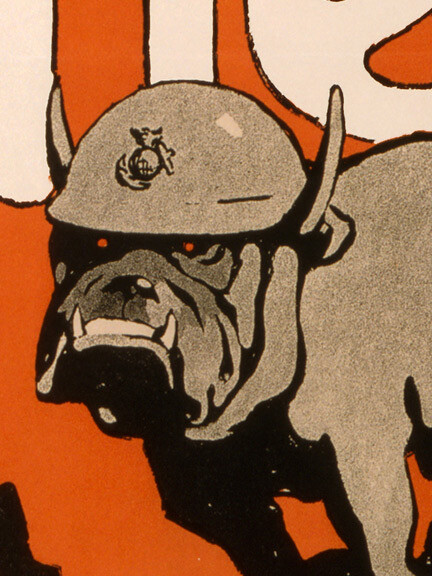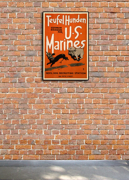 This great Vintage Style World War 1 Poster shows a bulldog wearing a Marine helmet, chasing a dachshund wearing a German helmet. The stirring caption reads: "Teufel Hunden - German nickname for U.S. Marines - Devil Dog Recruiting Station, 506 Fifth Street".