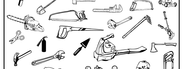 mowers, rakes, axes, sawzalls, weed whackers, chain saws,