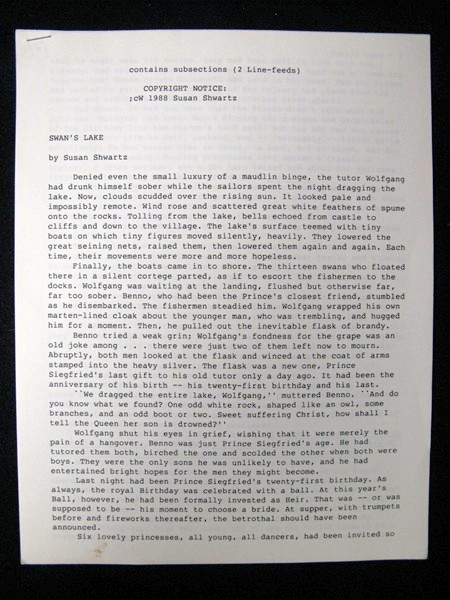 We are presenting for sale an original SUSAN SHWARTZ manuscript for the story he wrote entitled SWAN'S LAKE.