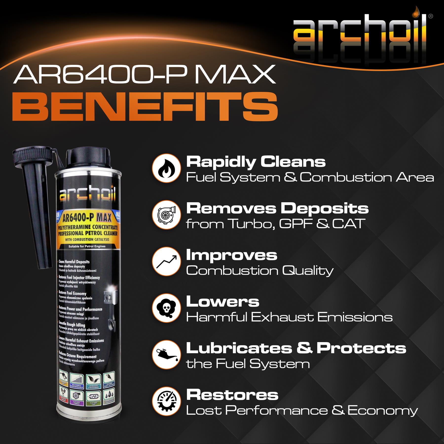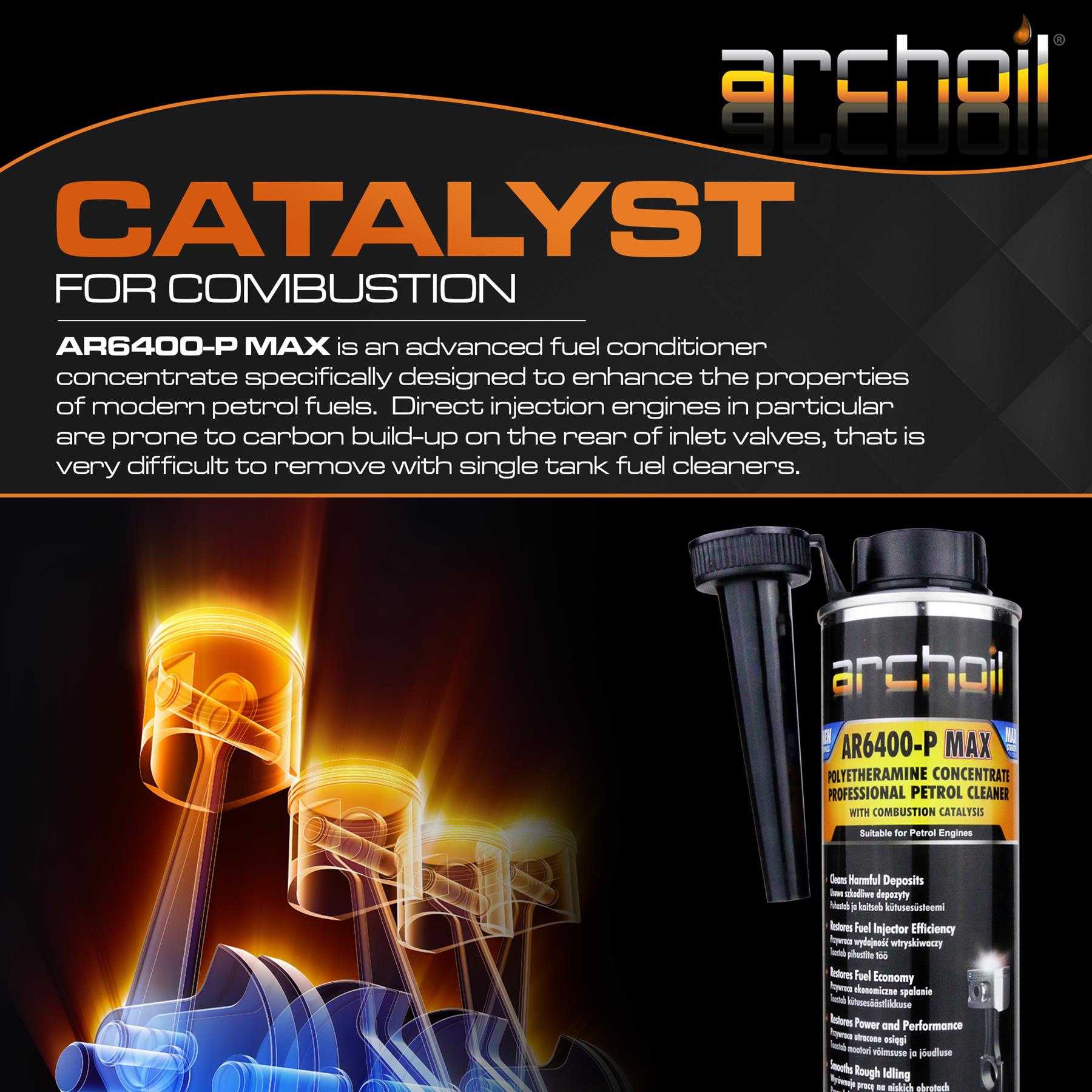 AR6400-P MAX quickly restores lost engine performance and fuel economy in addition to unique properties that help lubricate and protect surfaces from further deposit build-up. Molecule by molecule deposits are safely removed from intake valves, combustion chamber, piston tops, catalytic convertor and O2 (lambda) sensors. AR6400-P MAX improves combustion efficiency and reduces the propensity for pre-ignition/pinking.