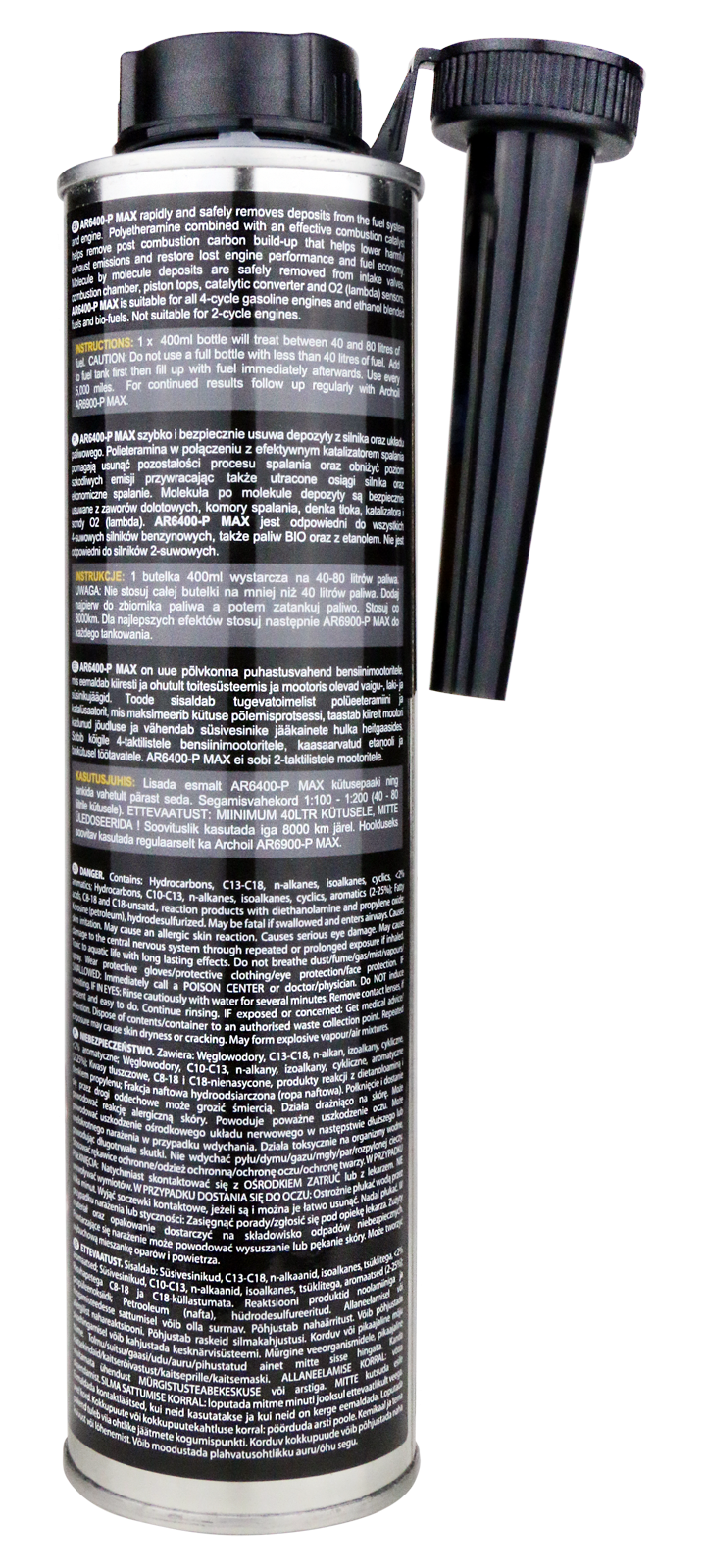 • AR6400-P MAX contains a proprietary blend of carefully selected detergents that effectively and safely remove deposits from the entire fuel system (fuel injectors, fuel filter, fuel pump, fuel lines), engine, combustion area, spark plugs, turbo, GPF, lambda (O2) sensor and catalytic converter.