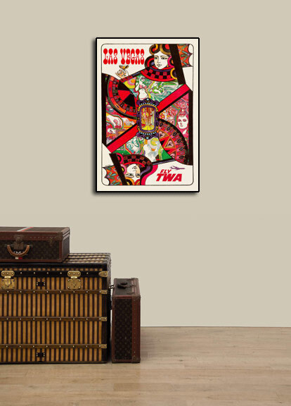 This great Vintage Style Travel Poster shows scenes of Las Vegas stylized to resemble a Queen playing card.
