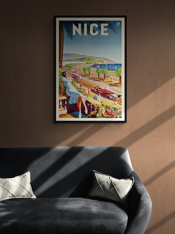 This great Vintage Style Travel Poster shows a woman reclining near a roadway as exotic cars drive below. The poster simply reads: “ Nice ”