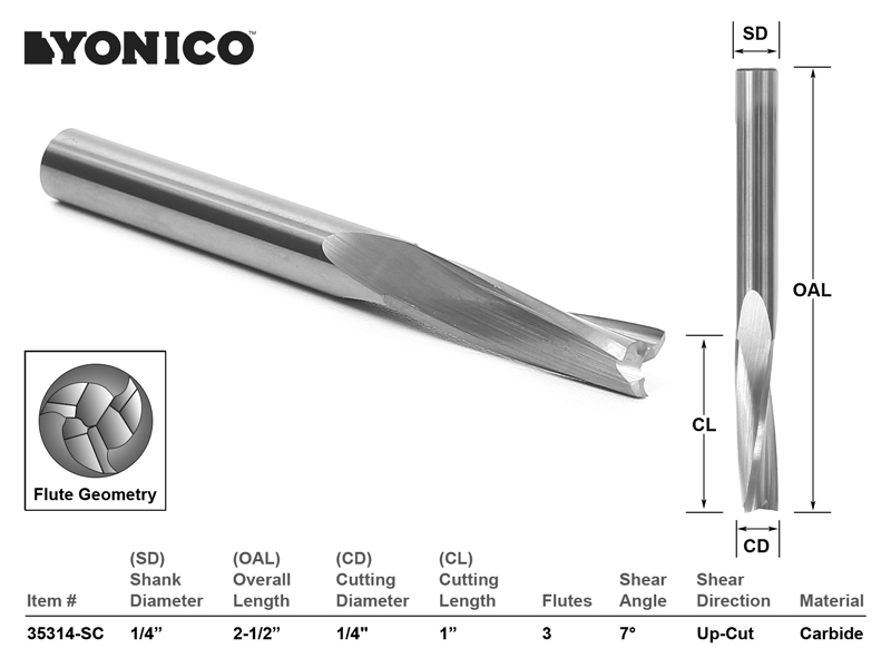 Best for achieving smooth finish on hard plastics.• Cutting Diameter: 1/4" • Cutting Height: 1" • Shank Diameter: 1/4" • Overall Length: 2-1/2" • Flutes: 3 Low Helix bits perform a more lateral movement with less lift resulting in a smoother finish. These bits are a better choice for hard plastics such as acrylic and phenolic. Up-cut endmills direct chips up and away from the milling area leaving an unobstructed path for the endmill. Bit breakage is less likely.