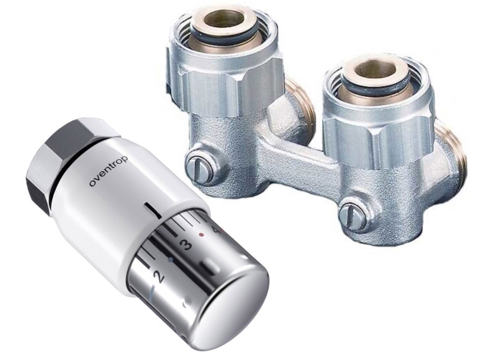- Oventrop Uni SH Thermostatkopf mit Gewindeanschluss und Oventrop Zweirohr Hahnblock ZB "Multiflex F" Eckform