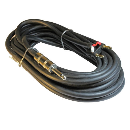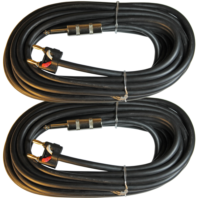 2 conductor 25 foot speaker cable fitted with 1/4" male connector on one end and dual banana plug on the opposite end.