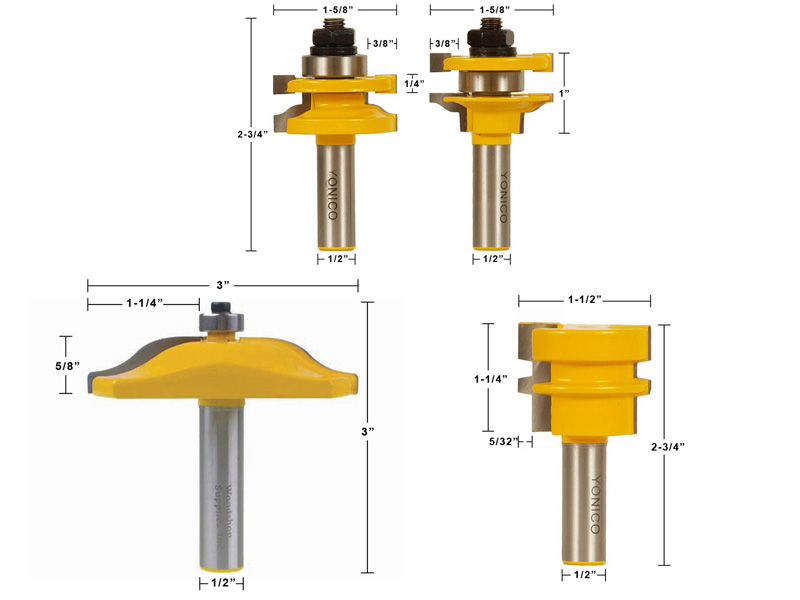 Make professional raised panel cabinet doors with the Yonico 12430 - 4 bit Router bit set. Included in this set: Ogee Raised Panel Bit, 2 bit Matched Ogee Rail & Stile, Reversible Glue Joint Bit, Allen wrench plus extra spacers, Solid wood storage case. Use with up to 1" stock. Rail & stile bits create a perfectly matched rail & stile door frame. The raised panel bit puts a classic ogee edge on the central panel of your door. Use the reversible glue joint bit for gluing up multiple boards to extend panel width. The glue joint bit will rout both joining cuts. Simply set the center of the bit with the center of your stock. Then, run one cut face up and the adjoining cut face down creating a perfect joint. Fully enclosed ball bearing guides allow for precise cuts without the use of a fence. Two flute carbide cutters & 1/2" shanks. Set comes in a solid wood storage case.