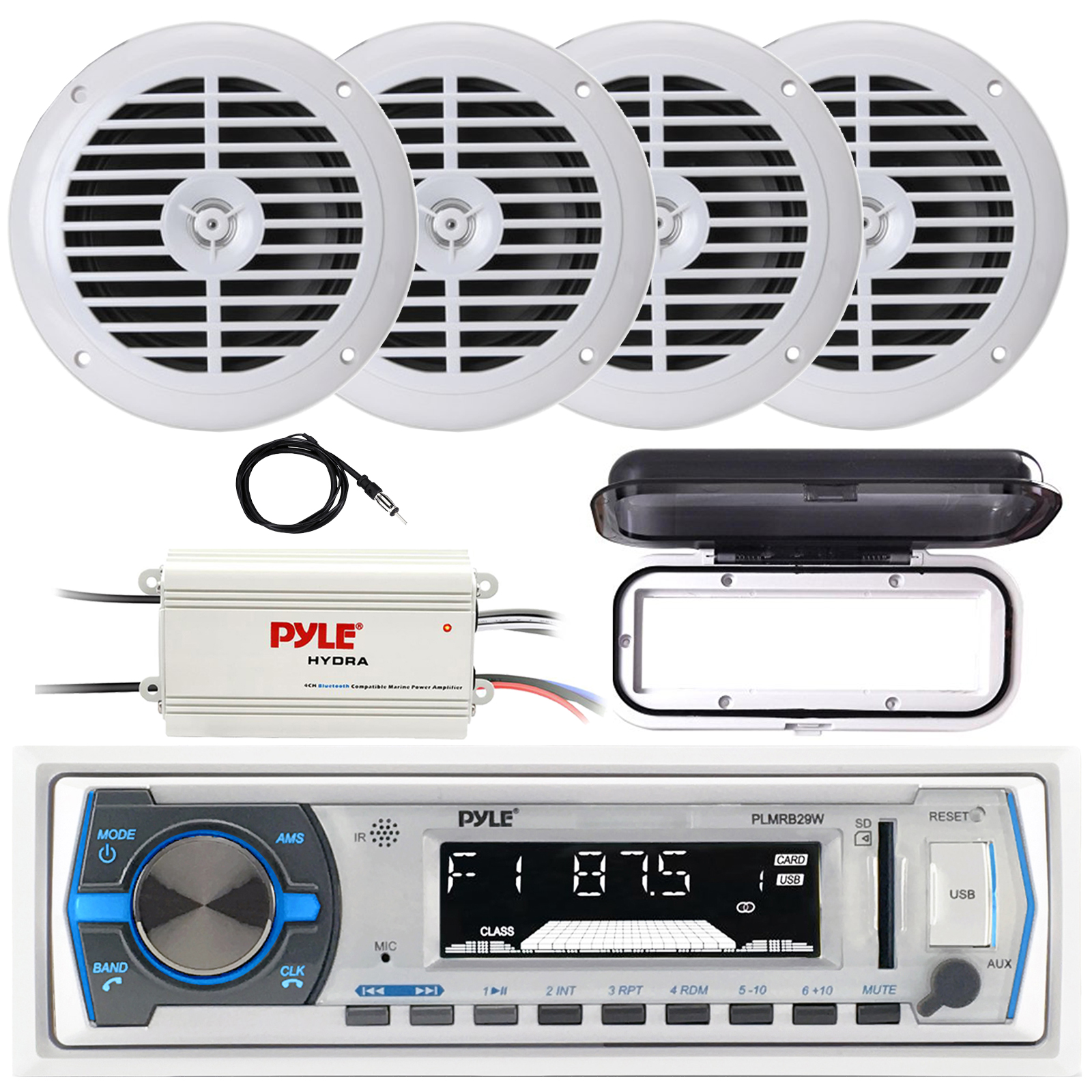 Pyle PLMRB29W Single-DIN Marine Bluetooth USB/AUX MP3 Player AM/FM Radio In-Dash Stereo White Receiver W/White Cover, 4x 6.5'' 120W Max Power Full Range Speakers, 4-Channel Amplifier, Radio Antenna