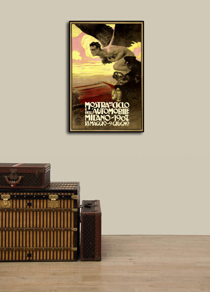 This Classic Vintage Style Automotive Poster shows a winged figure poised over the driver of a race car.