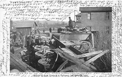 Very attractive and historic postcard showing view of 'Wreck of Erie Train (8?) at Falconer Jet, November 20, 1905.' The message to Stockholm, Sweden appears to be related in part to the event shown. Scarce card!