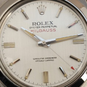 DIAL: ALL ORIGINAL AND EARLY MARK 1 VERSION WITH A WONDERFUL AND RARE SQUARE LOOM TRITIUM MARKERS APPLIED TO THE OUTER PARTS OF THE BATONS WITHOUT TOUCHING THE DIAL. THE LUME IS INTACT ON ALL MARKERS AND HAS NO LOSS WHATSOEVER! NOT EVEN WITH WITH 10X LOUPE. THE HANDS ARE NICELY MATCHED, ALL LUME IS INTACT AND MATCHING THE DIAL NICELY. THIS IS A VERY SUPERB EXAMPLE OF THE RARE AND BEAUTIFUL MILGAUSS. COLLECTORS DREAM. THIS IS ONE OF THE BEST VINTAGE ROLEX PROFESSIONAL WATCHES I HAVE SEEN!