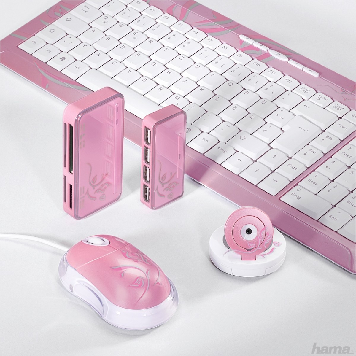 Passend zur Maus, zur Tastatur und zur Webcam der Serie Emerging, ist dieser Hub ebenfalls rosafarben und mit modischen Ornamenten versehen.