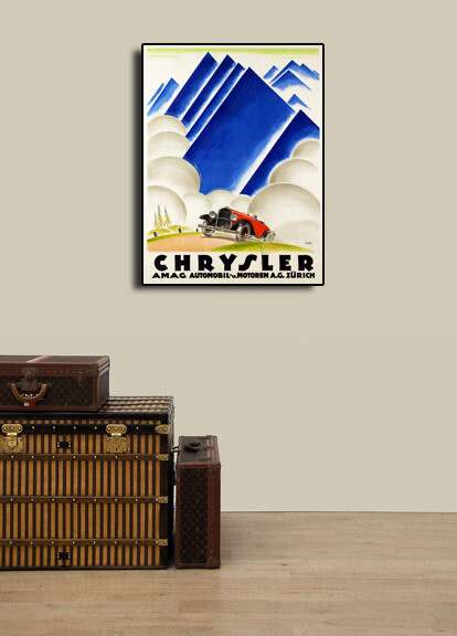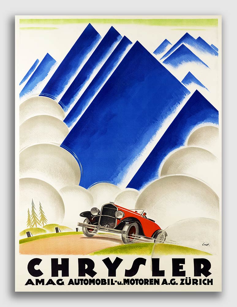 This Classic Vintage Style Automotive Poster shows a vintage Chrysler touring automobile on a road below stylized mountains.