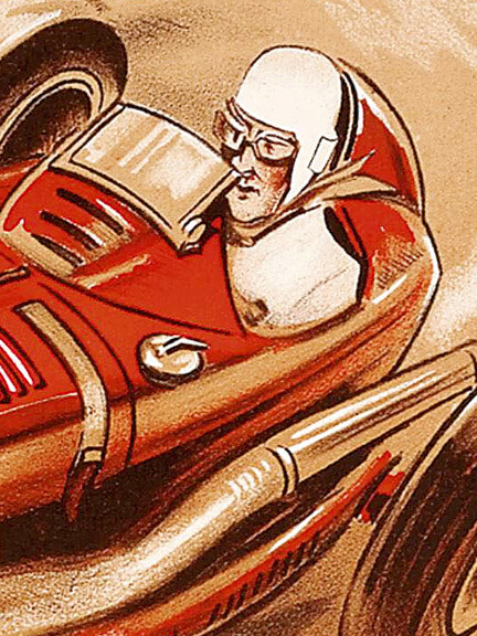 This Classic Vintage Style Automotive Poster shows several formula race cars speeding over a plain.