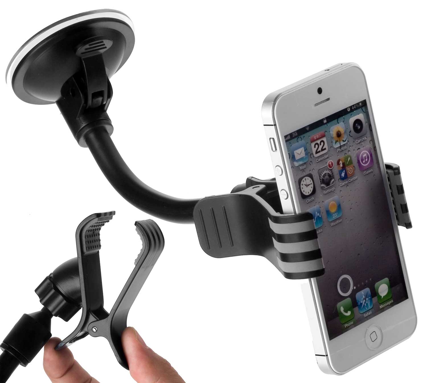 Universale Kfz-Halterung mit genialer und praktischer Klemmvorrichtung. Die Klemmhalterung ist um 360° drehbar. Optimierter Anpassdruck für den sicheren Halt. Mit dem stabilen biegsamen Schwanenhals lässt sich die Halterung in die gewünschte Position bringen. Geeignet für alle Geräte mit einer Breite bis zu 100 mm. Natürlich können auch andere Gegenstände praktisch und einfach in Griff-/ Sichtnähe befestigt werden, z. B. Anfahrtsbeschreibungen, Zigarettenschachteln, Getränkeflaschen und vieles mehr. Topqualität und Passgenauigkeit!!!