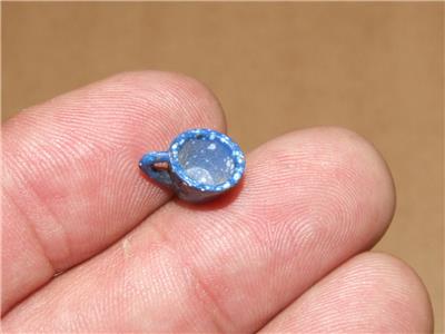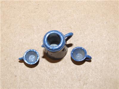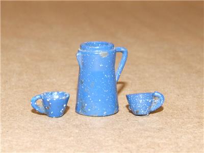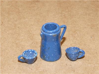 Vintage Miniature Doll House Blue Enamel Ware Coffee Pot & 2 Cups