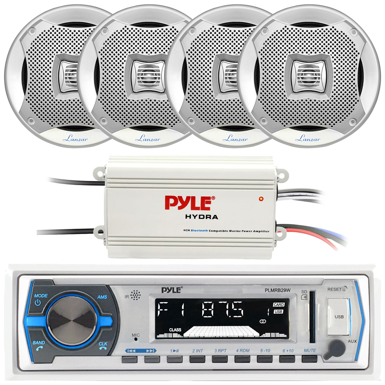 Pyle PLMRB29W Single-DIN Marine Bluetooth USB/AUX MP3 Player AM/FM Radio In-Dash Stereo White Receiver, 4x 6.5" 400W Max Power 2-Way Water-Resistant Silver Speakers, 4-Channel Bluetooth Amplifier