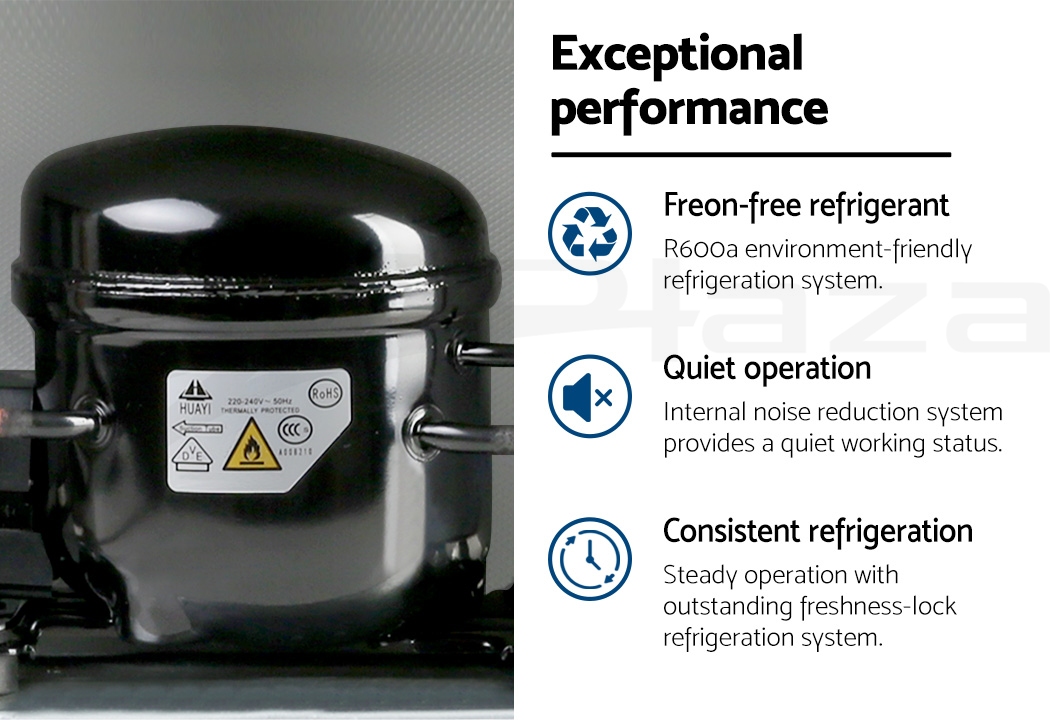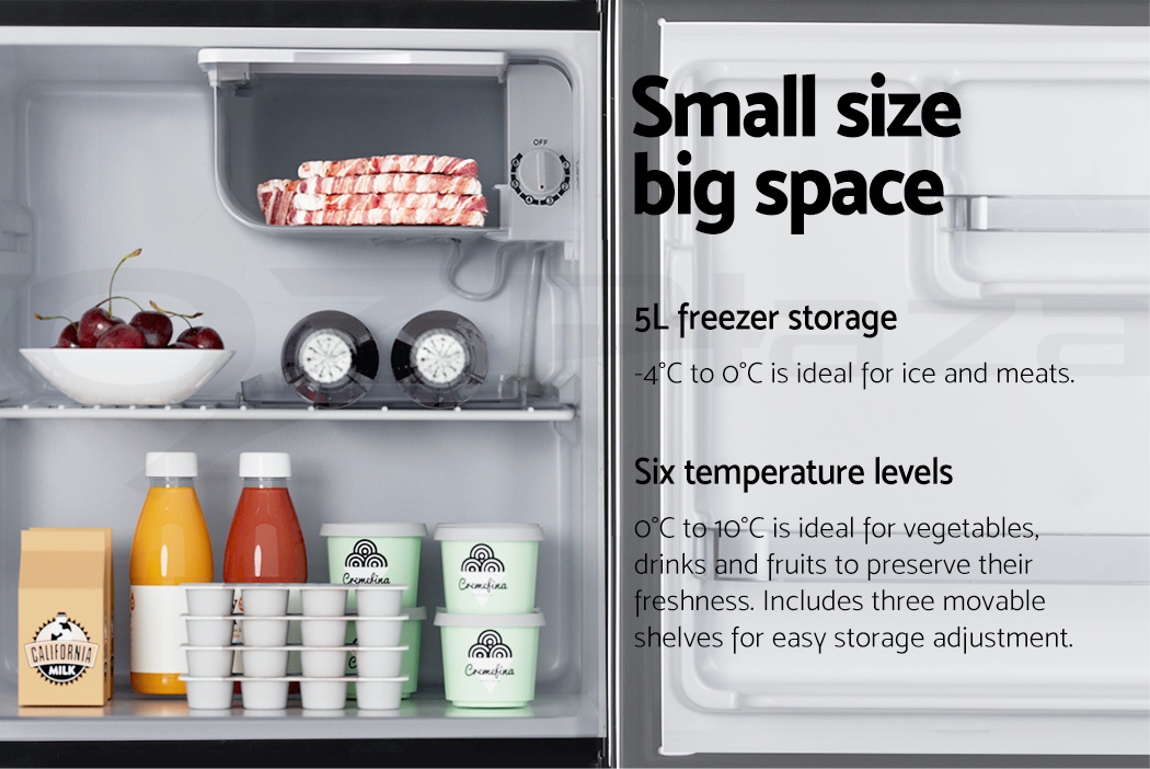 Designed with six adjustable temperature levels, the energy-efficient Bar Fridge lets you set your desired coolness and freshness. Other great features include a separate chiller compartment, twin temperature zones, manual defrost, height-adjustable feet, built-in handle, reversible door and consistent refrigeration to name a few. The compact Bar Fridge is also totally eco-friendly with its R600a freon-free refrigerant and well-made for robust use, such as the PVC door seal gasket, extra thick insulation and included water pan to ensure the operation is smooth, quiet and hassle-free.