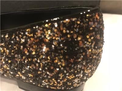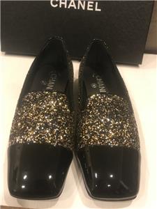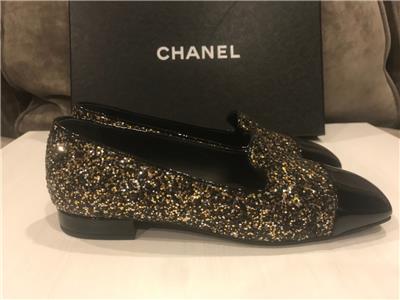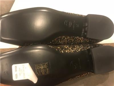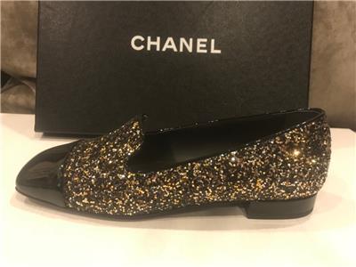 Glitter covered slip on loafers feature a black patent cap toe and 0.5" patent leather covered heel. Black CC logo at the sides. Padded leather insole and leather sole. Designer color: Black/Bronze. Made in Italy.