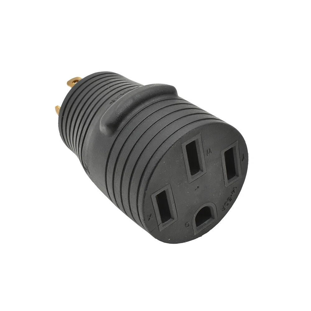 This locking 30A adapter provides power from a generator, or other power source with a L14-30 outlet, to devices using the straight blade 50A configuration such as large RVs and electric vehicles. The female connector is available in an easy grip handle design with LED power indicators or side grip wings for easily unplugging the adapter.