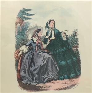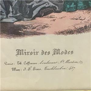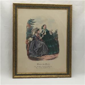 Here is a Framed REPRINT of a lovely old print entitled Miroir des Modes. This delicately colored print shows the lovely costumes of the mid 1800's. The plate has more information under the title. The script is "flowery" and hard to read. The print size is 11" by 14". The frame is about 12.5" by 15.5".