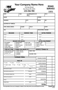 Roadside Service Form will be custom printed on 2 Part Carbonless Paper using black. Our custom printing for this towing invoices includes your company name, contact information and logo. Your forms will be sequentially numbering. This Towing Invoice form is designed for ease of use with check box sections listing the most common services provided by Road Side Service and Towing Companies.