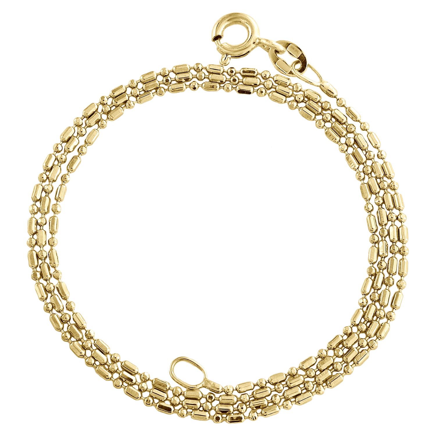 This real 10K Yellow Gold Beaded Chain Necklace is presented in lustrous gold, finished with a professional bright high polish for extra shine and luster. This chain measures 1mm wide and is available in different lengths. This chain comes in 16, 18, 20, 22 and 24 inches (check drop down to see which lengths are available in stock). The starting weight is approx. 1.60 gr. for 16" necklace. This chain is ideal for wearing by itself or with a pendant. The chain has a secure Spring Ring Clasp so it is easy to put on and take off.