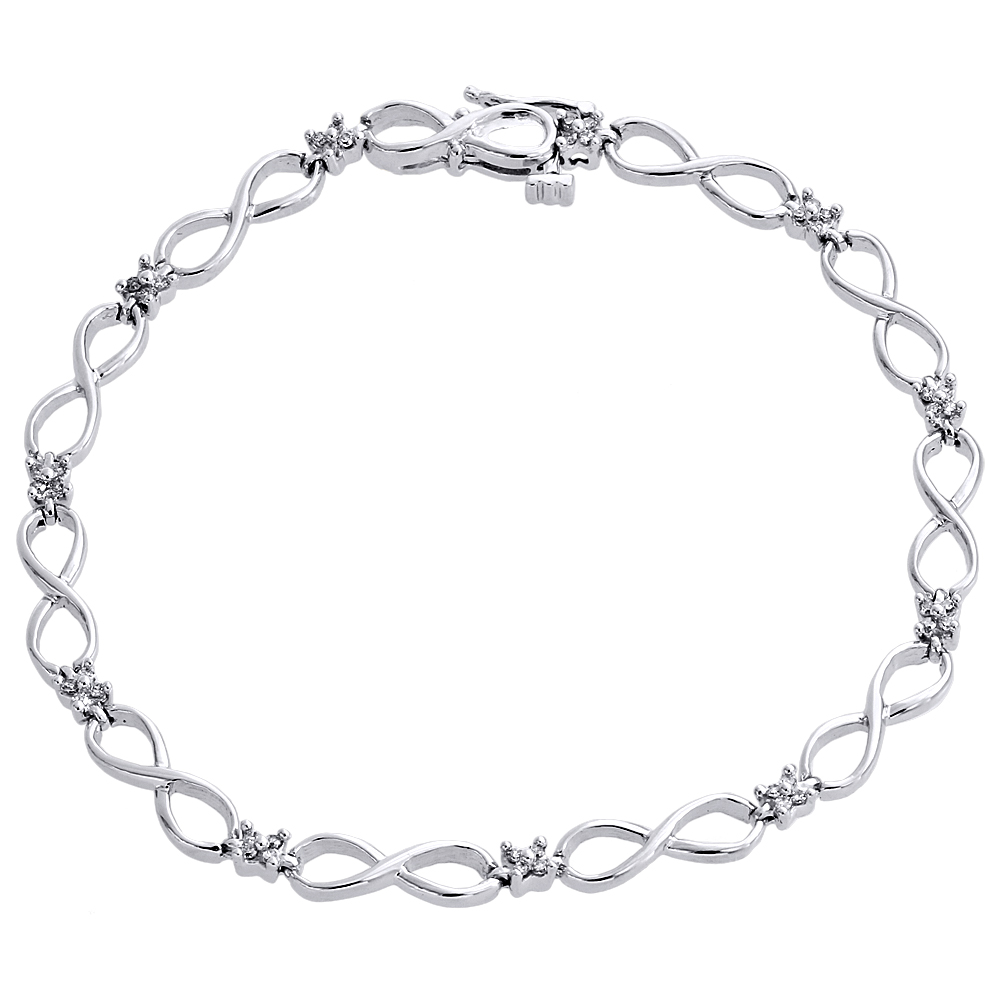 A new sophisticated and dainty style, this infinity frame bracelet with just a hint of subtle sparkle, this fashion bracelet suits her feminine style. Crafted in solid 10K White Gold with, this bracelet features shimmering round diamond, a gift she will always treasures. Clever infinity design pairs gracefully with round diamonds, a look that captures the eye. The round cut diamonds are set in prong setting. Radiant with 1/4 ct. t.w. of genuine diamonds and high polished to a bright lustrous finish. All the diamonds in this bracelet are of equivalent color and clarity, giving this bracelet a comparable shine and luster throughout.