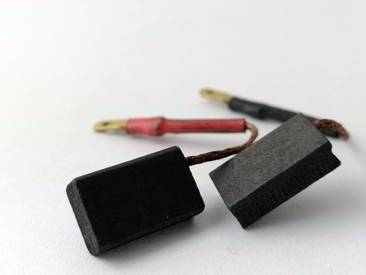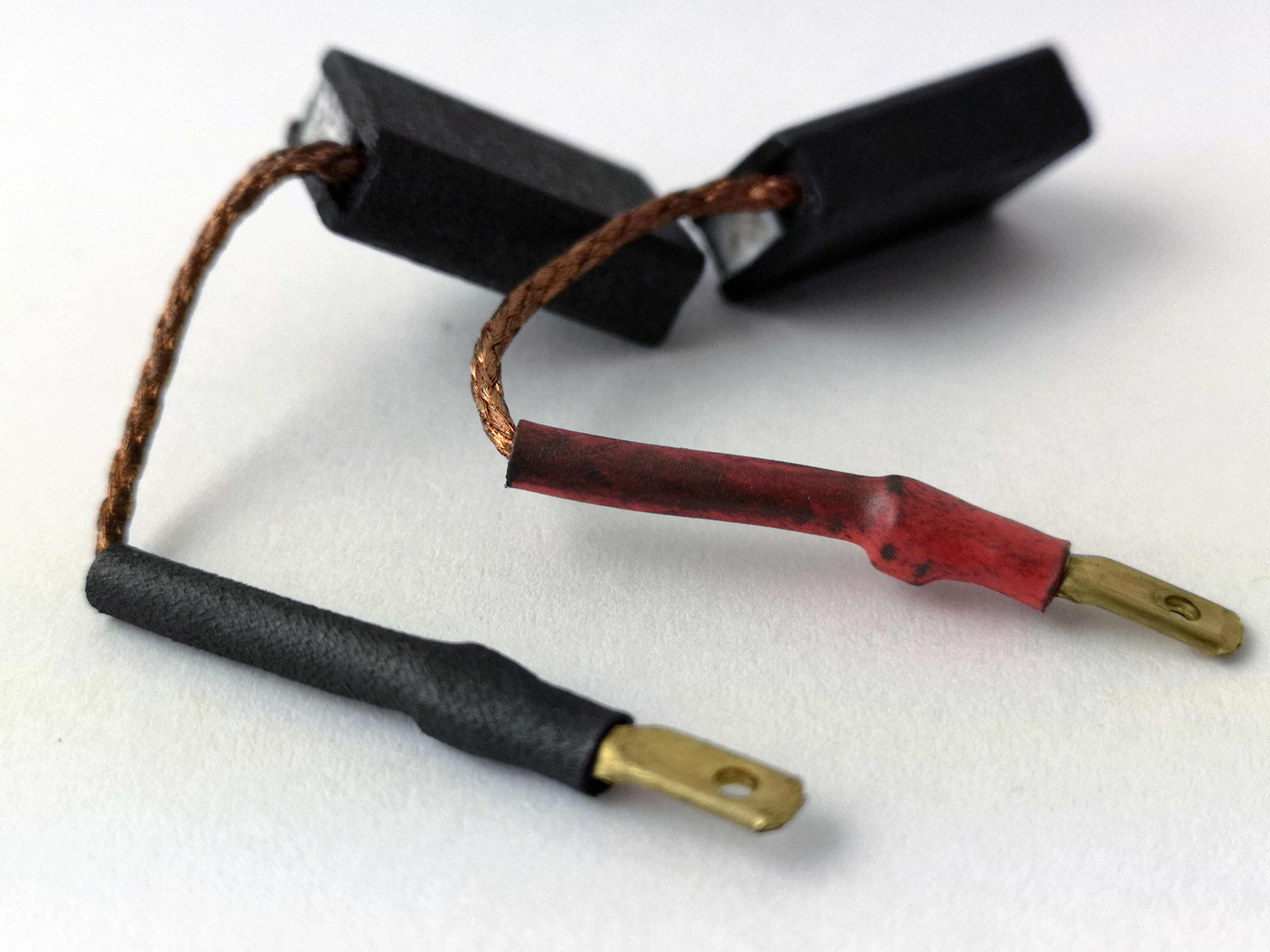 Die AMB Ersatz-Kohlebürsten sind unterschiedlich konzipiert, da eine der Beiden über ein Abschaltorgan verfügt (siehe Foto: Kohle mit roter Kabelisolierung).