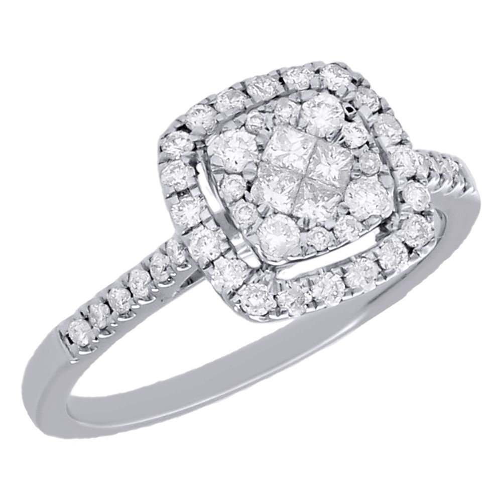 This beautiful white diamond ring is new additions to our diamond ring collection. Crafted in 14K white gold, this exquisite design features beautiful round diamonds in the center with a halo around it. Radiant with 0.50 ct. total weight of diamonds and polished to a bright shine, the diamonds are in shared prong setting for a firm and secure hold. All the diamonds on this ring are of equivalent color and clarity, giving this ring a comparable shine and luster throughout.