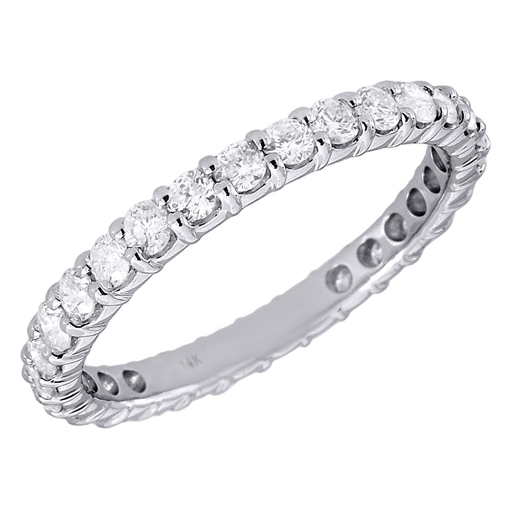 This item is part of our new diamond eternity band collection and comes brand new with tags and appraisal paperwork. A brilliant look that symbolizes all the love you share, this diamond eternity band has no beginning and no end. Beautifully crafted in 14K white gold, this elegant ring features row of glistening round diamonds. Radiant with 1 carat total weight of diamonds, this exceptional ring is finished with a bright polished shine. Each round diamond is full cut, and in prong setting. No better way to honor your wedding vows then a masterfully crafted eternity band.