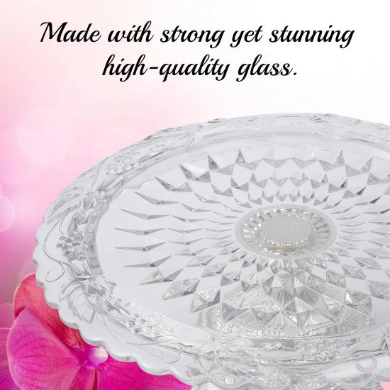 Made with strong yet stunning high-quality glass, this glass cake plate has an etched design in the glass and a beautiful silver plated pedestal base. This cake plate is perfect for special events like weddings, anniversary, parties, holiday dinners and more.