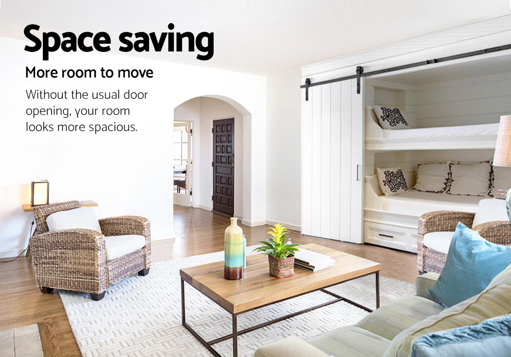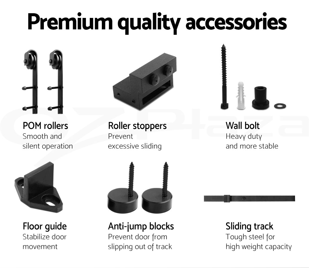 Featuring a contemporary Set, you get a host of premium quality accessories and fittings to create that dream door. Included in the Set is a sturdy rail track, smooth sliding rollers, floor guides, door stops and anti-jump track blocks to name a few. The rail track can support up to a 120kg timber or hollow core door for a 2.44m track. Not least, the Sliding Door Set works smoothly and quietly to ensure your piece de resistance is form and function in perfect harmony.