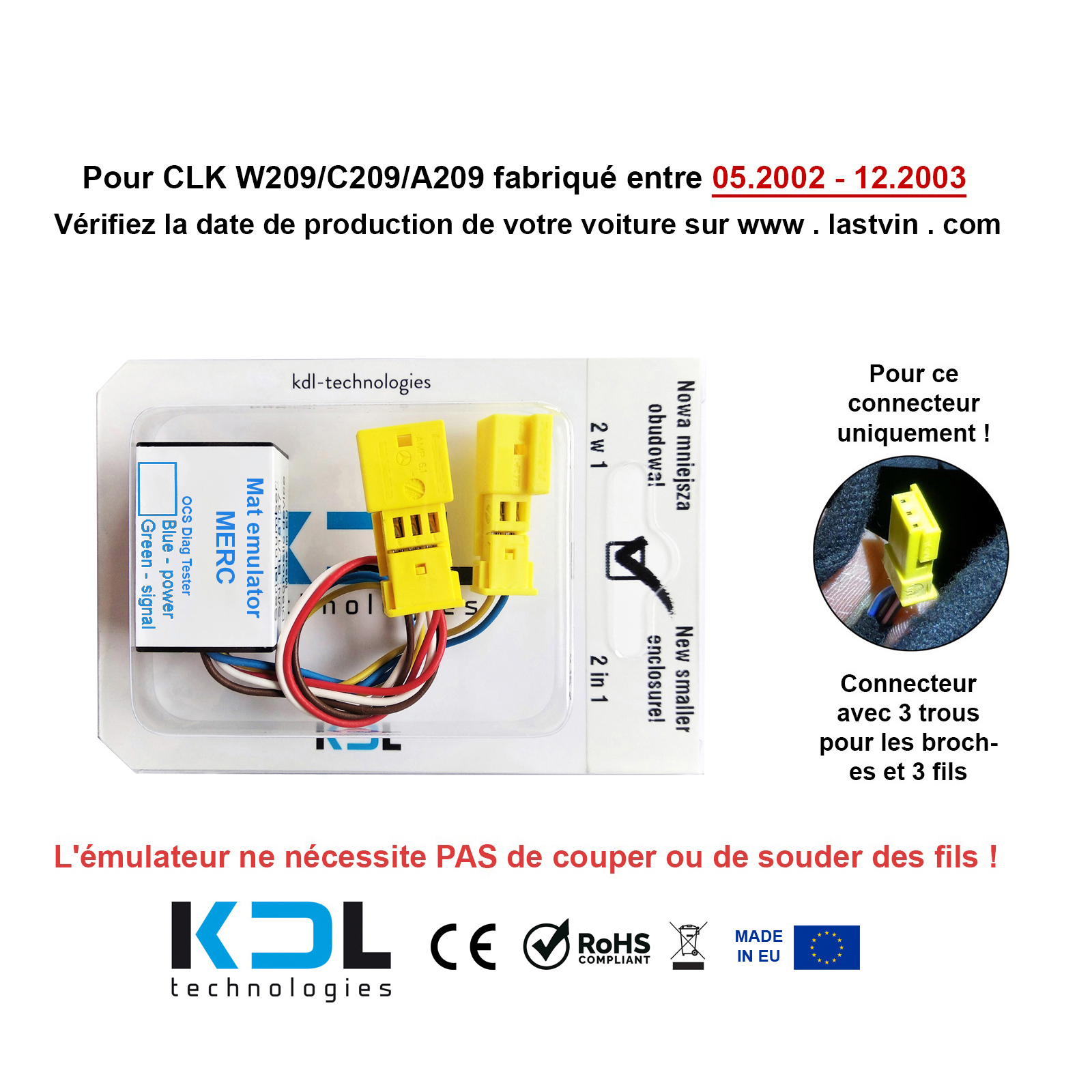 L'émulateur est destiné à un usage diagnostique uniquement. Il s'agit d'un appareil de diagnostic conçu pour vérifier l'exactitude de l'installation électrique de la voiture et pour déterminer si l'avertissement SRS/Air bag de votre voiture est causé par un capteur de tapis de siège défectueux. L'émulateur n'est pas un appareil d'usine ni un substitut au capteur d'origine. Après avoir effectué le diagnostic, vous devez déconnecter l'émulateur et reconnecter le capteur d'origine. Assurez-vous que l'installation de cet émulateur à des fins de diagnostic ne viole aucune loi de votre pays. En effectuant un achat, vous acceptez que nous ne soyons pas responsables des dommages ou pertes pouvant résulter de l'utilisation de l'émulateur, et nous ne sommes pas responsables des problèmes liés à votre système d'airbag. Nous ne sommes pas responsables des dommages ou blessures directs ou indirects causés par une mauvaise utilisation de l'appareil.
