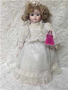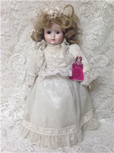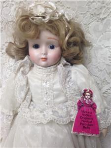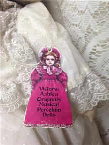 This is a beautiful 16-inch musical bride doll made of porcelain . She is in very good working condition with minimal age wear or soiling as shown in photos. It has its original label that says: House of Global Art; A division of House of Goebel, W. Germany; Victoria Ashlea Originals; Musical Porcelain Dolls. Package weight is about 3 pounds.