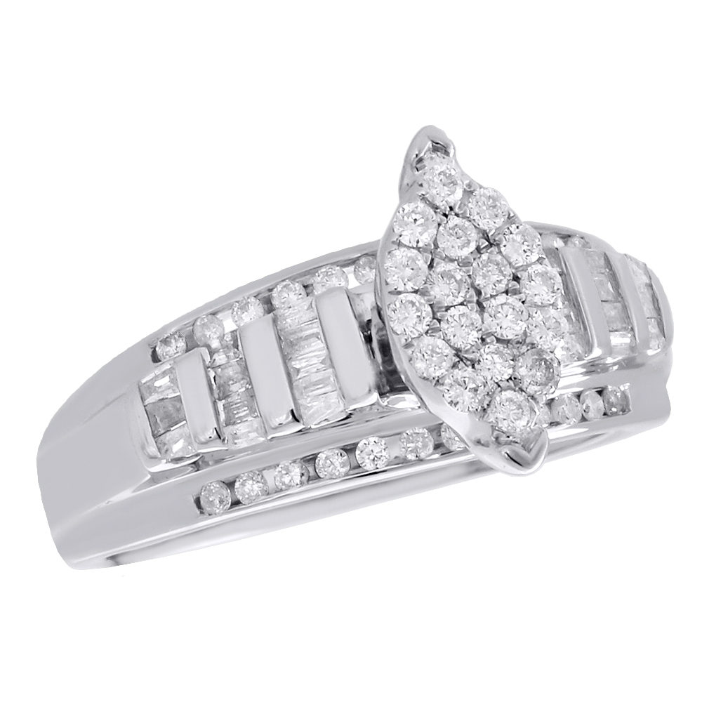 This exquisite diamond engagement ring, fashioned in .925 Sterling Silver. Crafted in 10K white gold, this exquisite design features a beautiful cluster of round diamonds in the shape of a marquise in the center. The sides of the ring showcases 2 rows of round diamonds in channel setting and 6 rows of baguette diamonds in the middle set in invisible setting. Radiant with 0.50 ct. total weight of diamonds and a bright high polished shine, this engagement ring will sparkle for a lifetime, a look she'll always treasure. Diamonds are held by shared prong, channel and invisible between the .925 sterling silver mounting. The diamonds are machine set precisely to give it a smooth uniform flow. Solid mounting, the ring weighs approx. 3.2 grams of .925 sterling silver. All diamonds in this ring are matching in clarity & color.