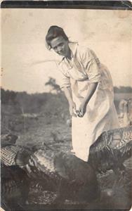 Very attractive and historic real photo postcard showing woman feeding ckicks. Identified on reverse with affixed newspaper clipping and message in her own hand. Great image!
