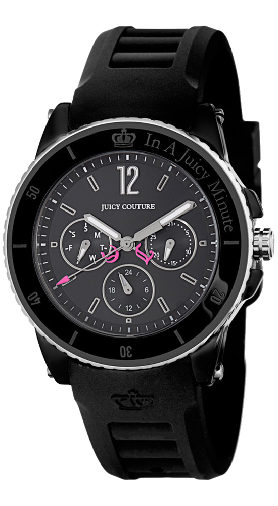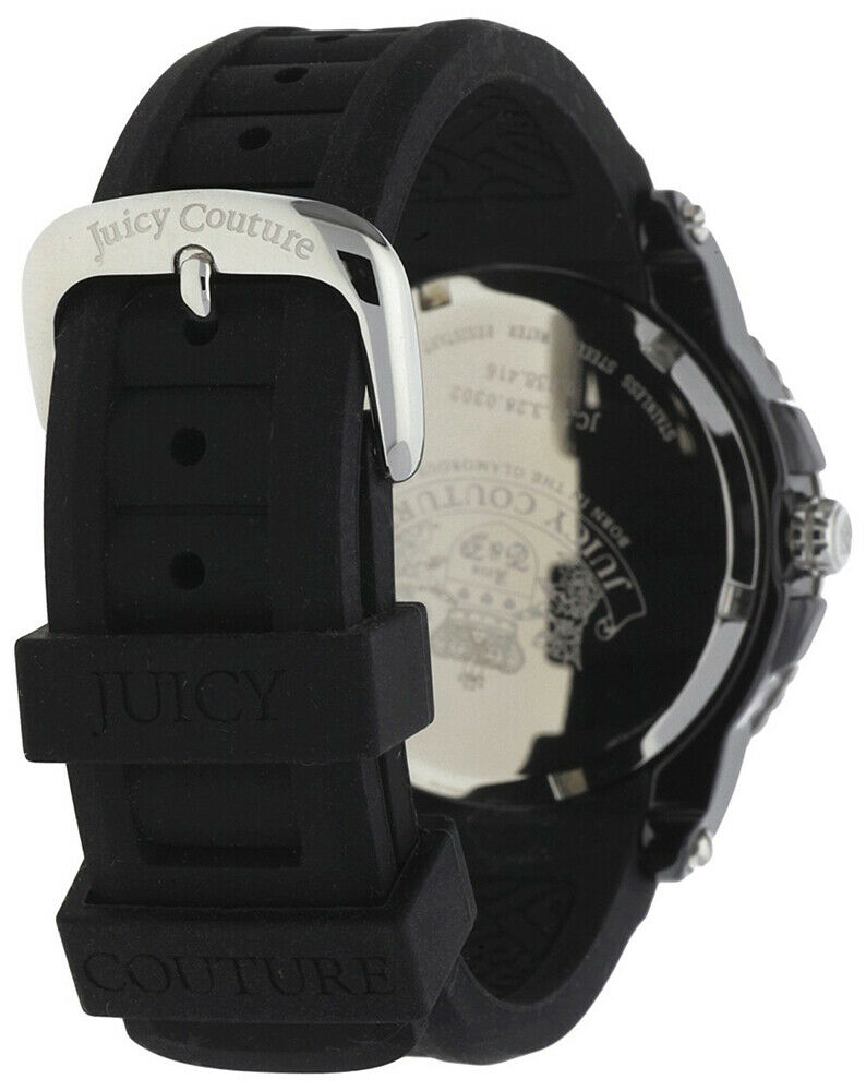 The Juicy Couture Pedigree Ceramic and Stainless Steel Case Black Sunburst Dial Black Rubber Strap Multi-Function Womens Watch Model # 1900754 features a black stainless steel and ceramic case that holds the black sunburst effect dial. The dial features three multi-function sub-dials for day, date and 24 hour display. The black durable rubber strap has ribbed designs in it that complement the overall look of the watch. The fixed black ceramic bezel features Arabic numeral minute markings engraved on it. This stylish and classy watch has an Arabic numeral marking at the 12 o'clock positon and silver-tone indices on its dial. The luminous hands help in giving better visibility during night time. You get a secure and customizable fitting with the pin buckle clasp closure on the strap. The watch has water-resistance capacity of up to 30 meters.