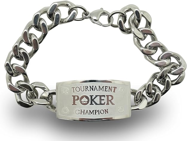 This Silver tone Link Poker Bracelet is perfect as a prize for your weekly tournament games. The Poker Bracelet measures 8 1/4" long and stays on with a clasp. One look at the player wearing this intimidating poker bracelet will cause your table opponents to fold away their pocket Kings pre-flop fearing that a player with such a bracelet could only have Aces! These Poker Bracelets make a perfect gift for every type of poker player, from the hardcore casino rounder, to the online shark, or even for the poker amateur just learning the rules! Perfect for all types of Poker Tournaments! This Tournament Poker Champion bracelet comes in an elegant black box for safe keeping! Click on Detailed images for additional pictures.