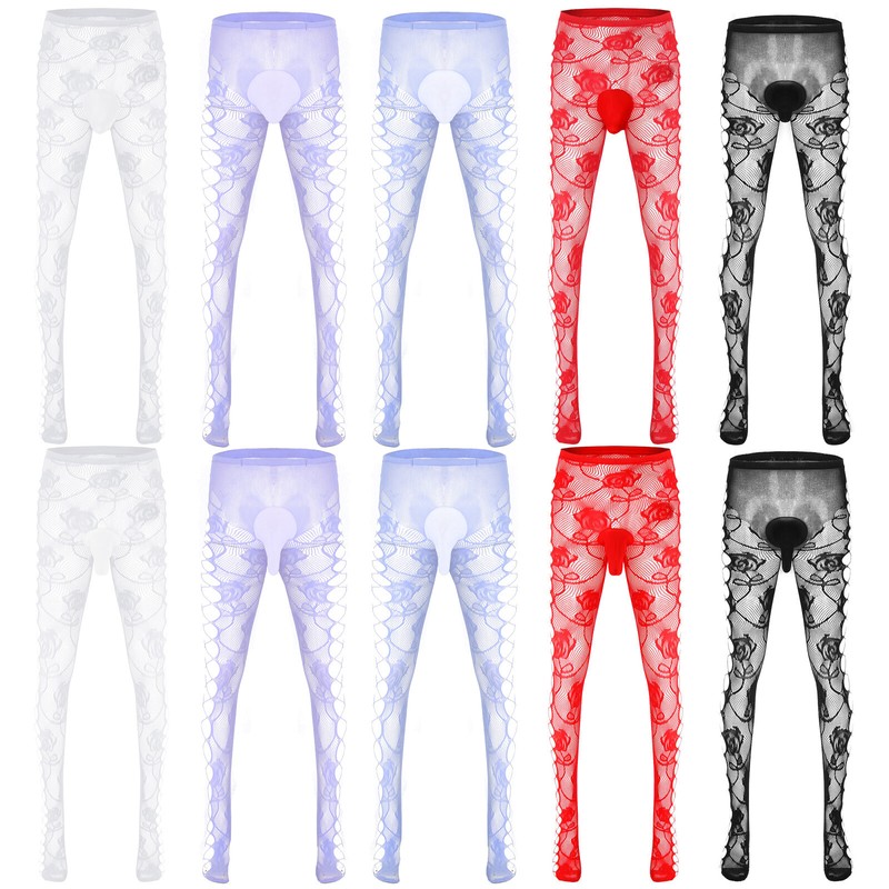 Removable bulge pouch, open butt, low waist with comfy elastic waistband, glossy appearance.
