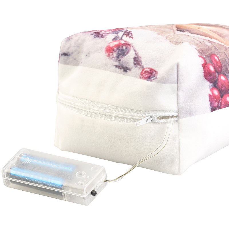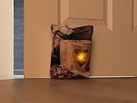 Kein Zufallen, dafür Auffallen: Ihre neuen Deko-Kissen legen Sie einfach auf den Boden oder das Fensterbrett. Dank der schweren Füllung halten sie Türen und Fenster auf Wunsch offen. Eine LED ist direkt unter der aufgedruckten Teelicht-Flamme platziert. Schalten Sie sie nach Belieben ein- und aus - schon sorgen so für weihnachtlichen Lichterglanz!