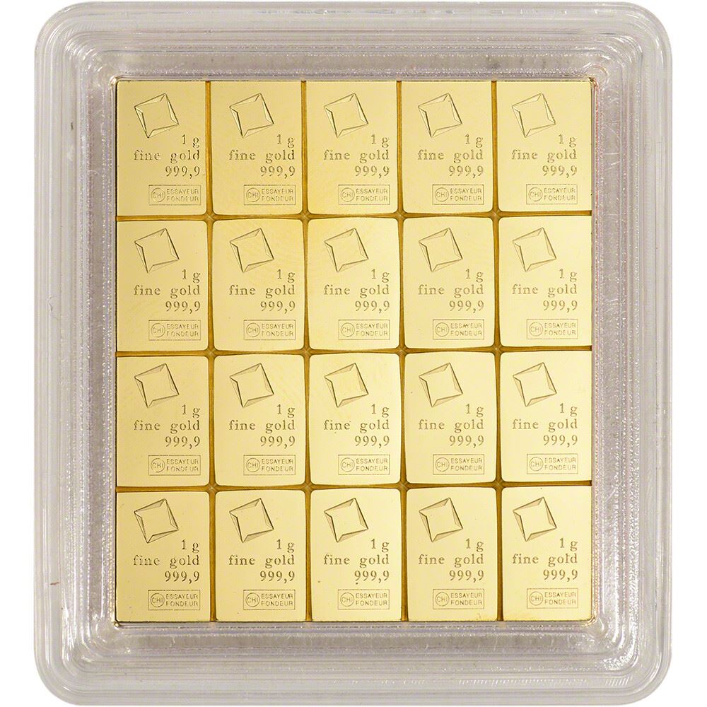 The 20 gram bar is pre-scored into 20 bars of 1 gram each. Each of the 1 gram bars is stamped with the Valcambi Suisse logo, the weight and purity "1g fine gold 999,9" and the assayer's stamp "CHI Essayeur Fondeur".
