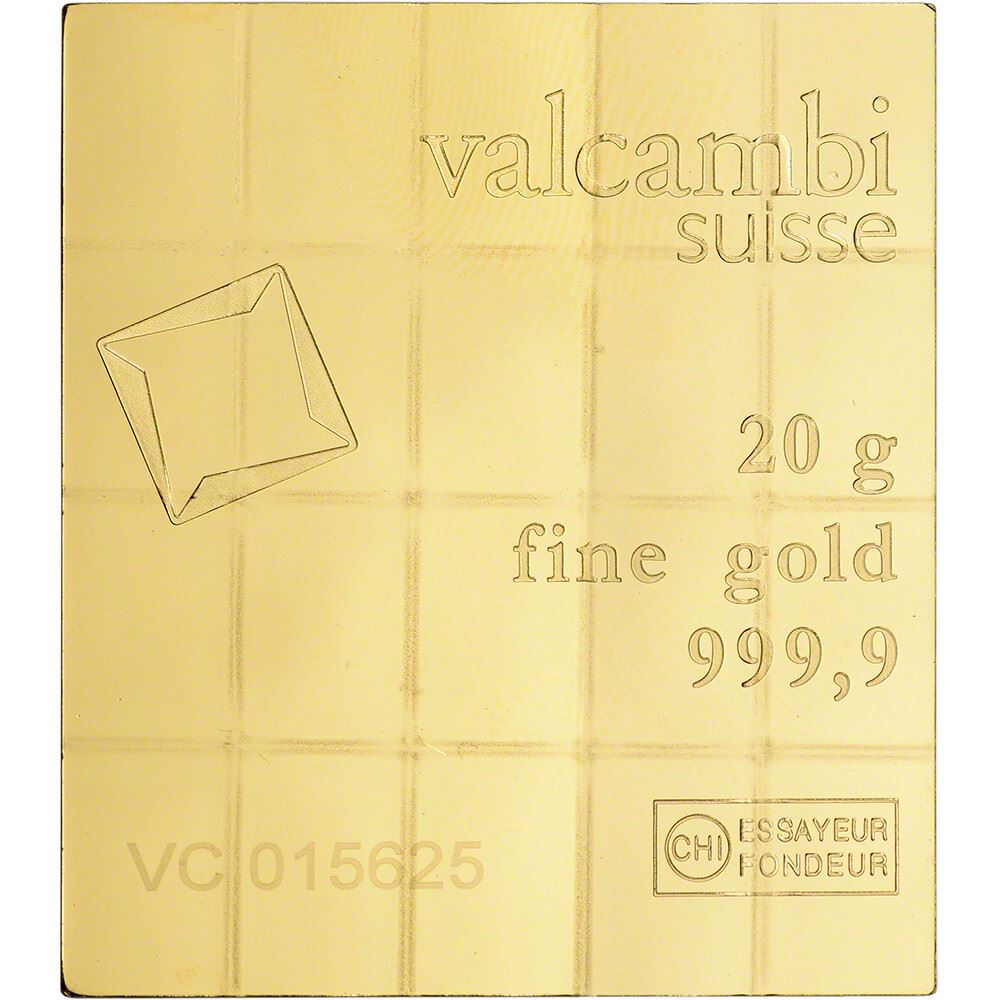 The reverse of the bar has the diamond-shaped Valcambi logo, "Valcambi Suisse", "20g fine gold 999,9", the serial number of the 20 gram bar, and the "CHI Essayer Fondeur" assay mark.