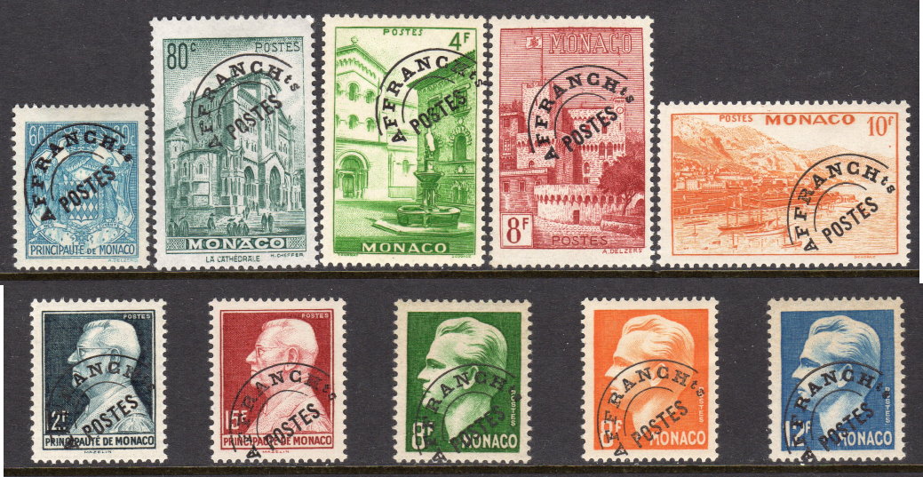 Monaco Scott # 151A//277 VF Unused 1943-51 First Precancels 60c-15F. Listed in Yvert et Tellier as #PO 1-10. Multiple wins will have shipping combined for a reduced rate. Many of my lots are for stamps that I have multiple copies of. For that reason, the photo may not be the exact stamp you will receive, particularly with the more common items. Please ask if it is important that you receive the pictured stamp. I am a 40+ year APS member. If you have any problems at all with your win, let me know and I'll fix the problem to the best of my ability. Currency conversion is as of the time the lot was created. This will vary as rates change daily. Please visit my eBay store for additional items at reasonable prices. Add additional items now to ship with your auction winnings and save on P&H charges.