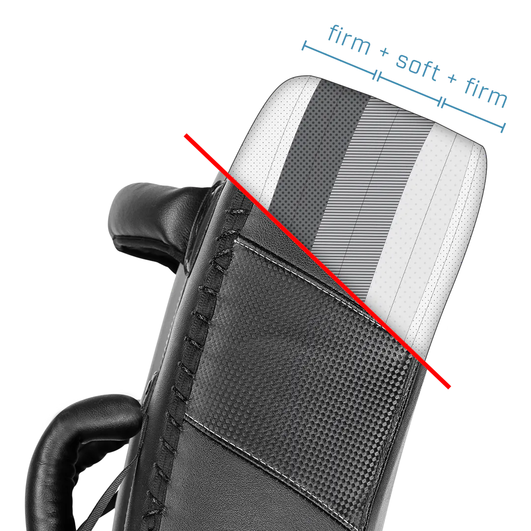 The foam composition has 3 zones: firm + soft + firm. The firm front layers absorbs the hit, which is then dispersed by the soft middle layers. Any left over force is then absorbed by the back layers of foam, which results in less force transferred to the person holding the kick shield.