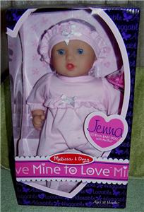 New in package, the package is in Fair condition, but it doesn't affect the contents, She is Brand New and has never removed from the package(the one in the picture is the one you will receive). For ages 18 months old and up. Jenna is the ideal, sweet smelling, first-born baby doll. Even the youngest mommy will love her sweet face and soft, cuddly body (and real moms will love her wipe-clean arms and legs!). She has molded plastic hair and is "pretty in pink" from head to toe, in a removable smocked outfit and matching cap. Her blue eyes open and close, and she can suck her thumb or her pacifier (included). Comes from a smoke- free home. We combine shipping with most of our other items, message me before you purchase. Shipping is $11.50. Thank you for stopping by~!~!~